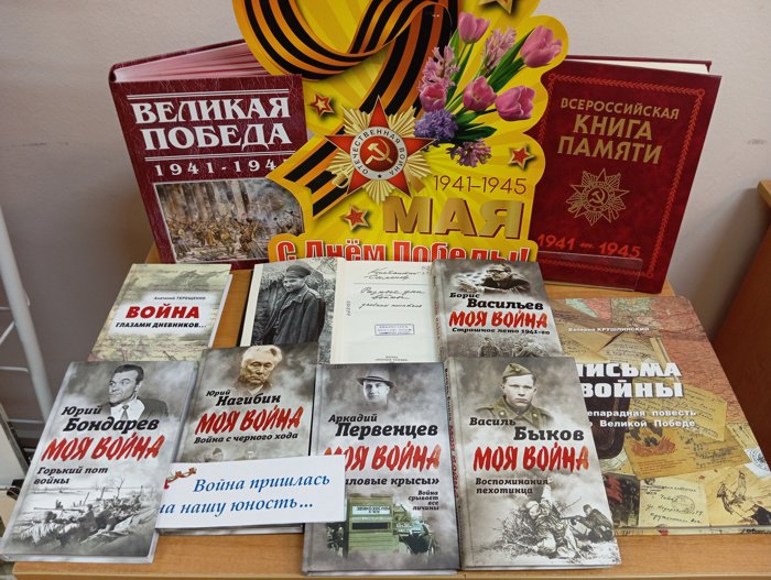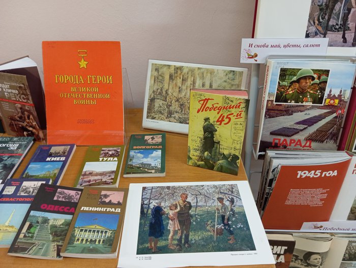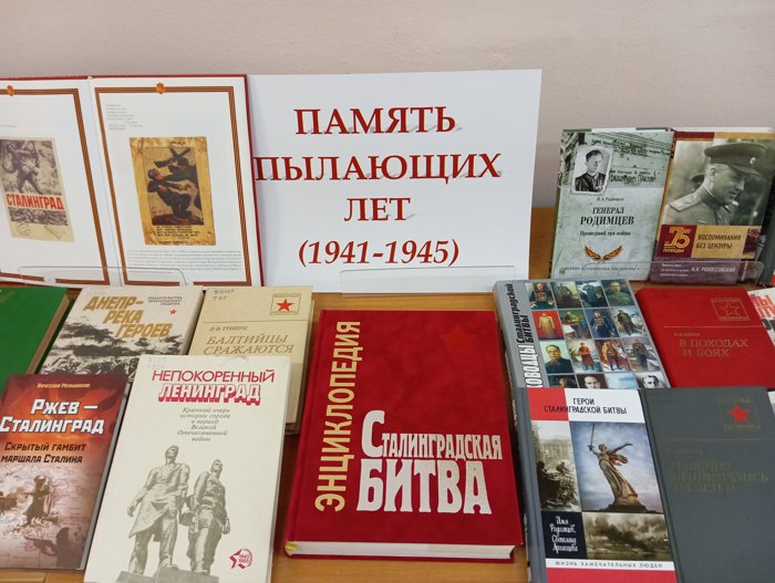В зале каталогов развернута выставка «Память огненных лет». В разделе «Дорогами Великой Отечественной» представлены книги о самых значительных сражениях тех лет - Битва за Москву, Сталинград, Кавказ, оборона и блокада Ленинграда, Курская дуга и другие. Раздел ««Лица Победы» - это книги о генералах и рядовых, тех, кто ковал победу на фронтах сражения. В разделе «Победный май» представлены книги о взятие Берлина, о ликовании и празднование победы в городах и селах, о Параде Победы. Раздел «Война пришлась на нашу юность» знакомит с книгами писателей, чья юность начиналась с кирзовых сапогов. Это В. Быков, Б. Васильев, Ю. Бондарев, А. Первенцев и другие. Книги изданы в серии «Моя война».
