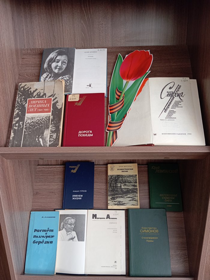 На книжной выставке «Поэзия военного поколения» (к.108) представлены поэтические сборники о войне с пронзительными строками К. Симонова, А. Межирова, С. Орлова, Ю. Друниной, С. Гудзенко, И. Уткина и других поэтов.