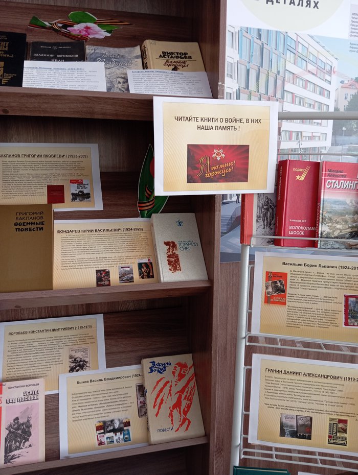 После Победы в литературу пришло новое поколение писателей. «Это были люди, которые все тяготы войны вынесли на своих плечах - от начала её и до конца. Это были люди окопов, солдаты и офицеры; они сами ходили в атаки, до бешеного и яростного азарта стреляли по танкам, молча хоронили своих друзей…» (Бондарев Ю. Взгляд в биографию). Е. Носов, Г. Бакланов В. Курочкин, В. Богомолов, А. Ананьев, О. Гончар, М. Алексеев, В. Быков, В. Кондратьев, К. Воробьёв, В. Астафьев и другие рассказали свою правду о войне. Рассказали правдиво, искренне, пронзительно. Их произведения позже назовут «лейтенантской прозой»... Они считали, что не имеют права на ложь, потому что выжили и говорят от лица целого поколения. Первым произведением этого жанра в военной литературе является написанная в 1946 году повесть Виктора Некрасова «В окопах Сталинграда». Лучшие романы и повести о войне представлены на выставке «Бессмертный книжный полк» (к.108).