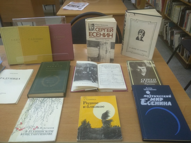 Мы уверены, что в ваших домашних библиотеках есть томики стихов Есенина. Если же вы хотите больше узнать о жизни поэта, прочитать все его стихи, поэмы, прозу мы приглашаем Вас на выставку, подготовленную к 125-летию поэта отделом гуманитарно-просветительской работы. На выставке, представлены произведения поэта разных лет, в том числе Собрание сочинений в 6-и тт. (1979).