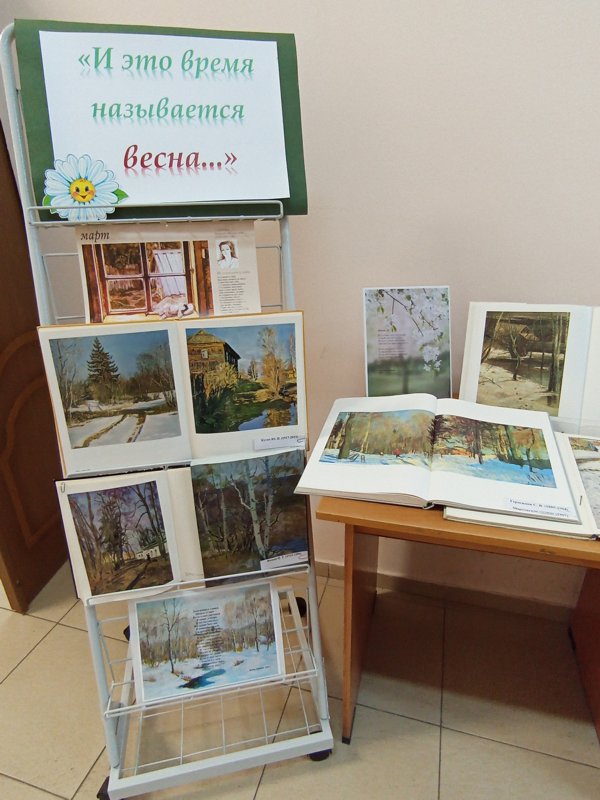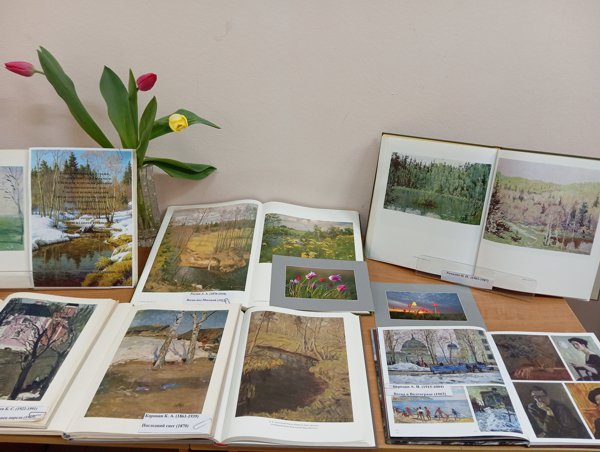 В зале каталогов на выставке «И это время называется весна» можно увидеть альбомы художников, в творчестве которых природа занимала важное место. Весна, пробуждение природы – одно из прекраснейших и романтичных времен года. Все это нашло отражение в творчестве русских художников-пейзажистов. На их полотнах весна разная, у каждого своя, это и тающий мартовский снег с разливами рек, цветение садов и пение прилетевших птиц, звонкая капель и журчание рек. На выставке представлены такие имена как А. Саврасов (1830 - 1897) - русский художник-реалист, первооткрыватель жанра лирического пейзажа в русской живописи. Его удивительно светлое полотно «Вид на Московский Кремль. Весна», его знаменитые «Грачи прилетели». Весенние пейзажи И. Левитана «Весна. Большая вода» (1897), «Март» (1895) - одни из самых поэтичных русских пейзажей XIX века, где все пронизано ожиданием преображения природы, приходом весны, а с ней надежда - на хорошее лето, на урожай, на счастье. В творчестве А. Пластова (1893-1972) жизнь человека в гармонии с природой - главное для художника. В его картинах о приходе весны - тяжелое небо, хлопья снега ещё падают - но всё-таки весна. И это чувствуют герои его картин «Весна» и «Деревенский март». На выставке также представлены весенние пейзажи Игоря Грабаря(1871-1960), работы таких художников как С.В. Герасимов (1885-1964), Крылов А.К. (1902-1990), Фомин П.Т. (1919-1996) и других художников.