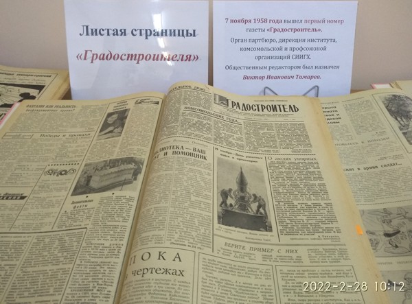 В отделе обслуживания научной литературы (к.104) на выставке представлены подшивки газеты «Градостроитель» начиная с 1962 года. Все события, происходящие в вузе, активно освещались на страницах вузовской газеты. Среди авторов – преподаватели, студенты, многие из которых в дальнейшем трудились в нашем институте.