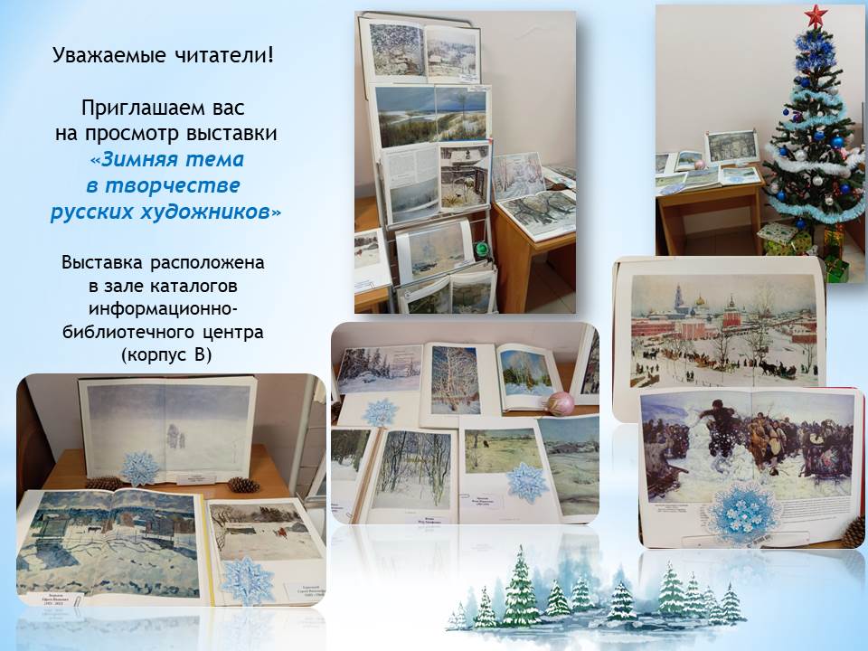И если у вас за окном пока не снежно, приглашаем в информационно-библиотечный центр (зал каталогов) посмотреть картины с зимними пейзажами на страницах альбомов классиков русской живописи.