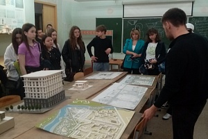 Пройдя по внутреннему двору ИАиС, школьники с интересом познакомились с памятным знаком «Строителям Сталинграда», скульптурной композицией «Возрождение Сталинграда», узнав о главных архитекторах, которые восстанавливали город после войны.