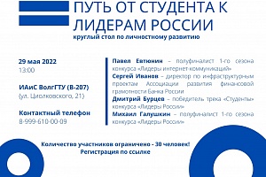 В Институте архитектуры и строительства ВолгГТУ 29 мая, с 13-00, в конференц-зале (В-207) состоится круглый стол по личностному развитию «Путь от студента к Лидерам России». Участников ждут увлекательные мастер-классы по проектам платформы «Россия - страна возможностей» и грантовым площадкам.