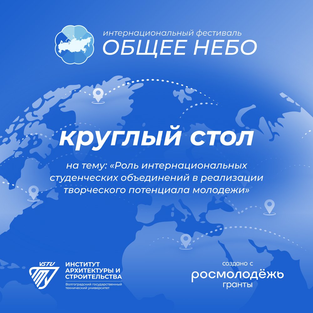 Мероприятие пройдёт в рамках интернационального фестиваля «Общее небо» и соберёт за одним столом студентов, представителей студенческих объединений, руководство вуза, а также официальных гостей — представителей органов исполнительной власти Волгоградской области. Круглый стол призван стать площадкой для диалога о важности межкультурного взаимодействия в образовательной среде и способах раскрытия талантов через сотрудничество представителей разных национальностей.