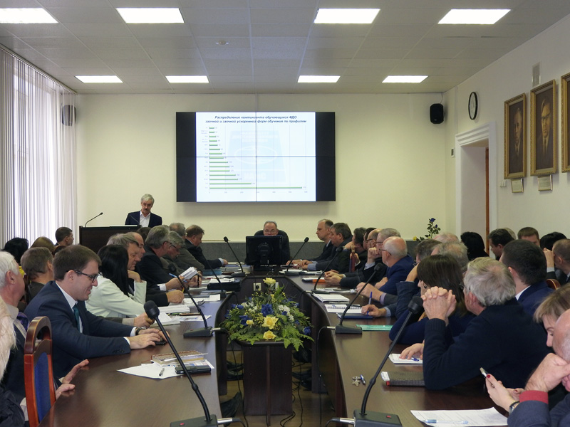 Содокладчик – декан факультета дистанционного обучения Олег Викторович Душко поделился информацией о состоянии дел на ФДО. На факультете осуществляется образовательный процесс по 16 направлениям бакалавриата, специалитета и магистратуры (32 профиля). Всего на факультете обучаются 2315 человек, из них: по заочной форме обучения (бюджет) – 481 человек, по заочной форме (ПКО) – 665 человек, по заочной ускоренной форме обучения – 1104 человека, остальные – по вечерней форме обучения ускоренной и ПКО. Приема на 1 курс ФДО, по словам декана, в основном проводится за счет платно-контрактной формы обучения, доля бюджетных студентов здесь очень мала. Денежные поступления за отчетный период, 2016–2018 гг., в среднем составляют более 50 млн руб. в год. По итогам приемной кампании этого года на обучение в ФДО было принято 631 человек, из них 531 на платно-контрактной основе, кроме того, организована обратная связь с потенциальными студентами – их 2500 человек, а в планах – ежегодно принимать не менее 350 человек на заочную платно-контрактную форму обучения. Речь шла и о модернизации материально-технической и социально-культурной инфраструктуры, а также о программе дополнительного профессионального образования «Развитие цифровой среды в образовании», о формировании портфеля востребованных образовательных программ и т.д.
