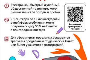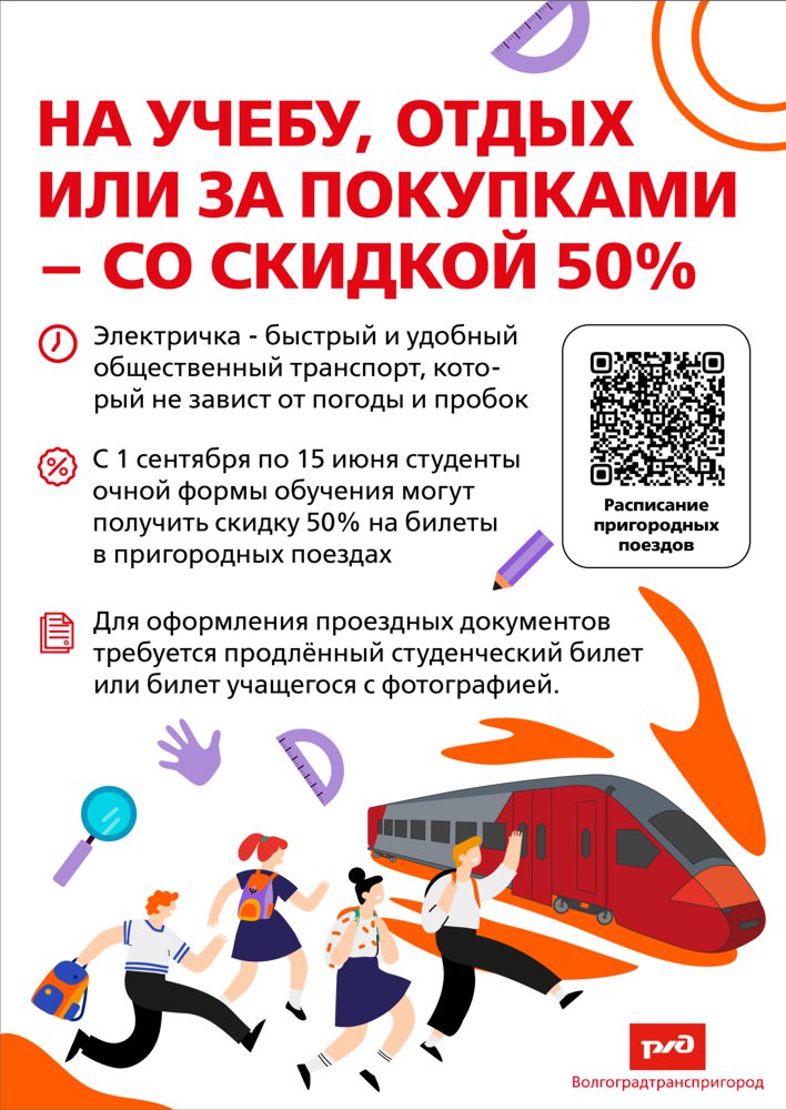 АО «Волгоградтранспригород» информирует, что с 1 сентября по 15 июня действуют льготные условия проезда для студентов очной формы обучения. Учащиеся высших и средних специальных учебных заведений очной формы могут оформлять билеты на пригородные поезда со скидкой 50% по продленному студенческом билету на текущий год.