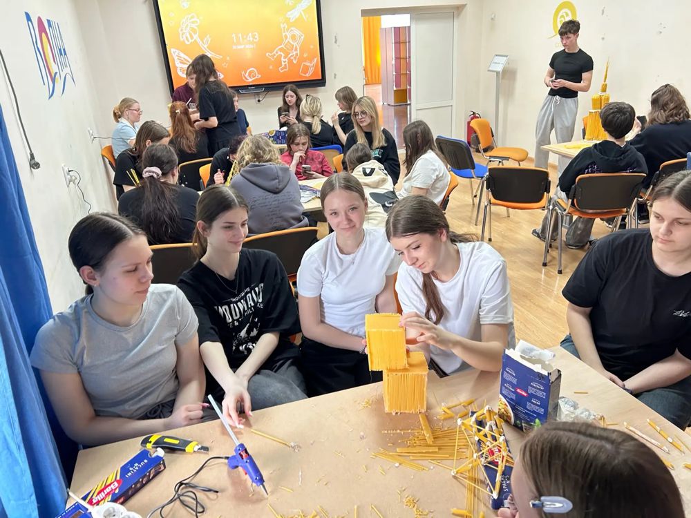 Наши юные архитекторы и строители, вооружившись клеевыми пистолетами, фантазией и килограммами макаронных изделий разных форм, превратили аудиторию в настоящую архитектурную мастерскую.