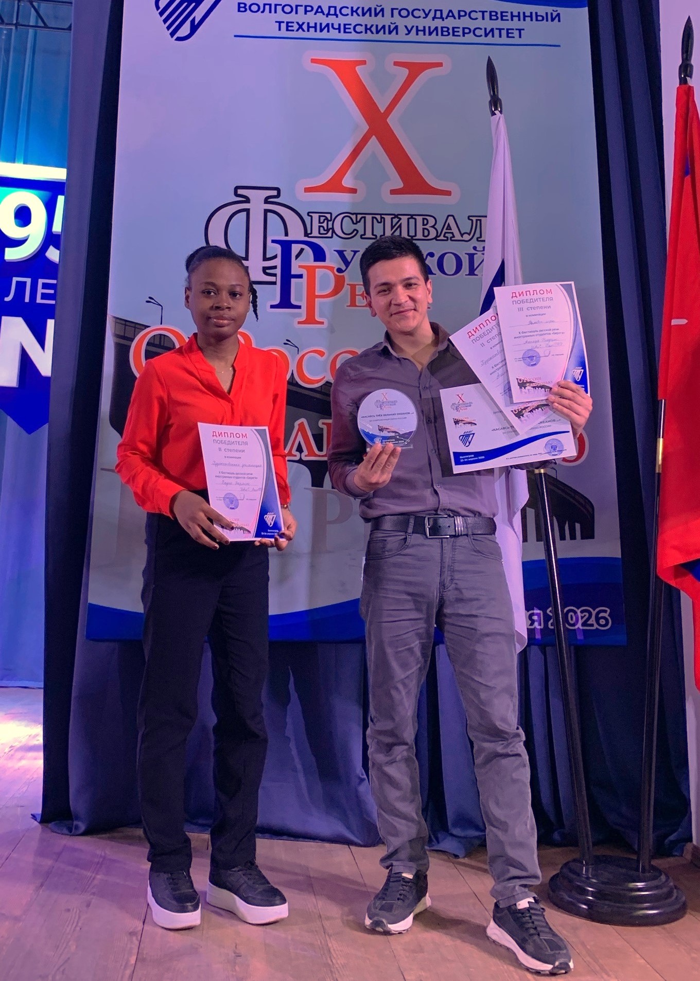 Конкурентная борьба была очень напряженной, ведь в каждой номинации соревновалось не менее 15-20 студентов, а призовых мест, увы, только три. И нам очень приятно сообщить, что у команды ИАиС есть три диплома! Бадио Дарлине, студентка группы ПГС-3-25, заняла второе место в конкурсе декламаций, блестяще прочитав очень сложное стихотворение К. Бальмонта «Безглагольность», а Аганязов Ниязгулы, студент группы ТЭОН-1-25, стал призером сразу в двух номинациях: декламации (со стихотворением К. Симонова «Родина») и ролевых инсценировках. Однако с уверенностью можно сказать, что не только призеры, но и абсолютно все участники команды ИАиС выступили на очень высоком уровне! Это отметили и члены жюри, называя имена наших студентов, которых от пьедестала отделяли буквально одна-две строки итогового рейтинга участников. Благодаря успешному выступлению команда ИАиС удостоена специальной награды в номинации «Современный образ России».