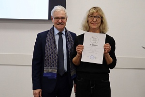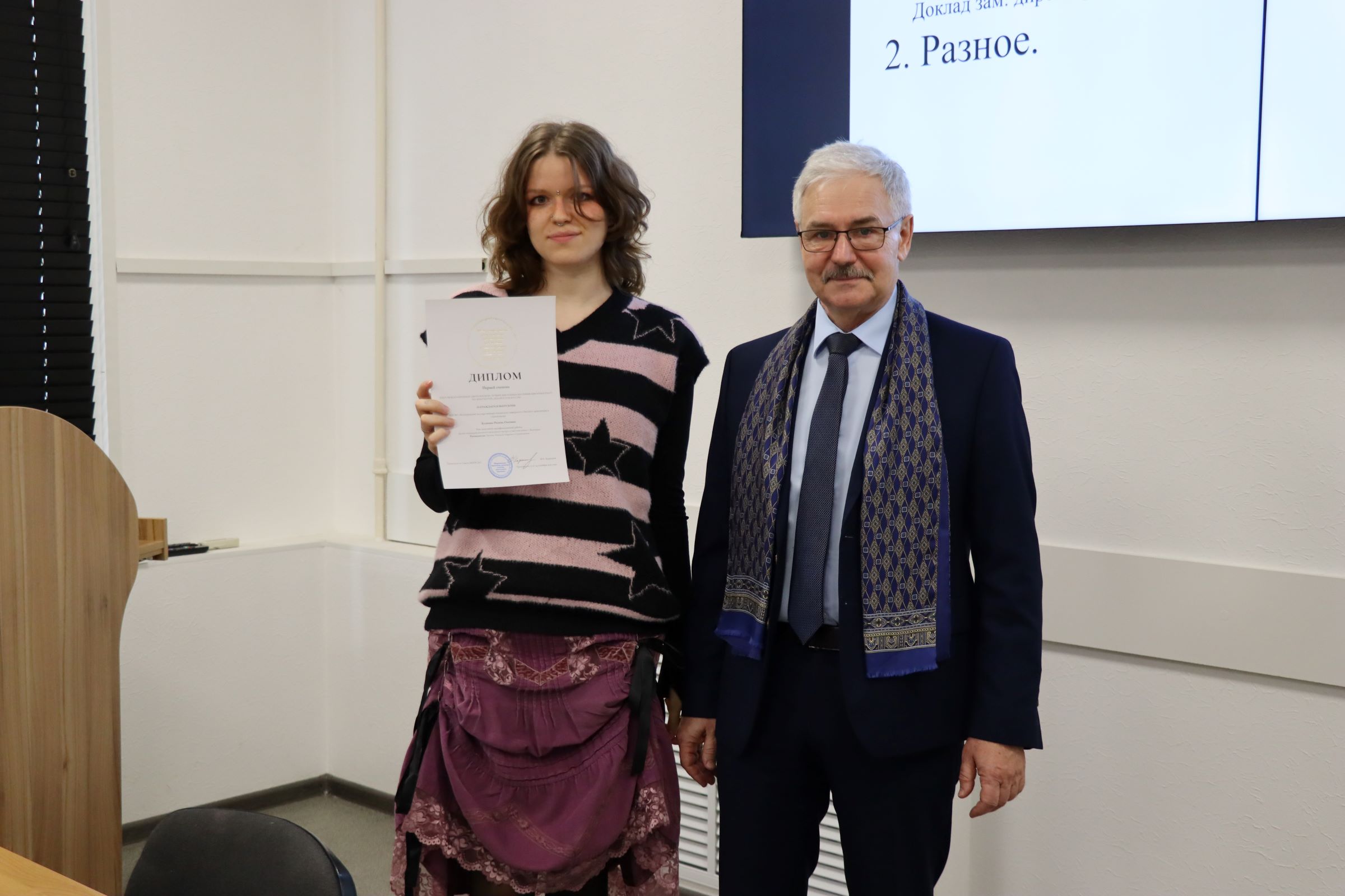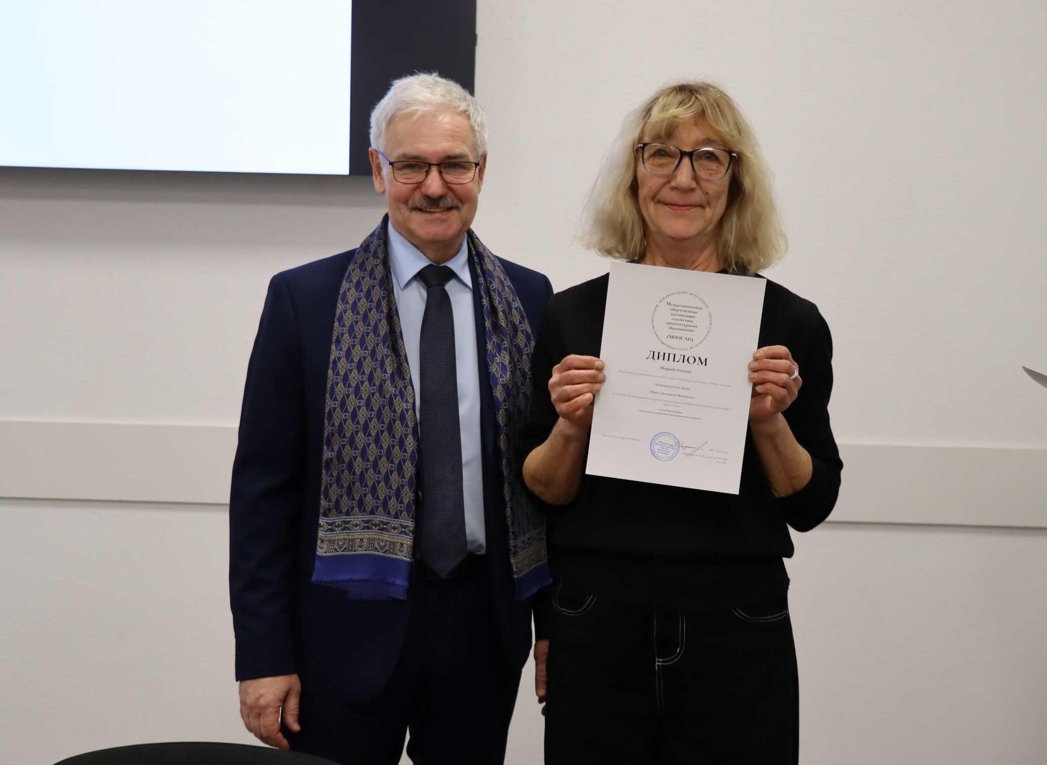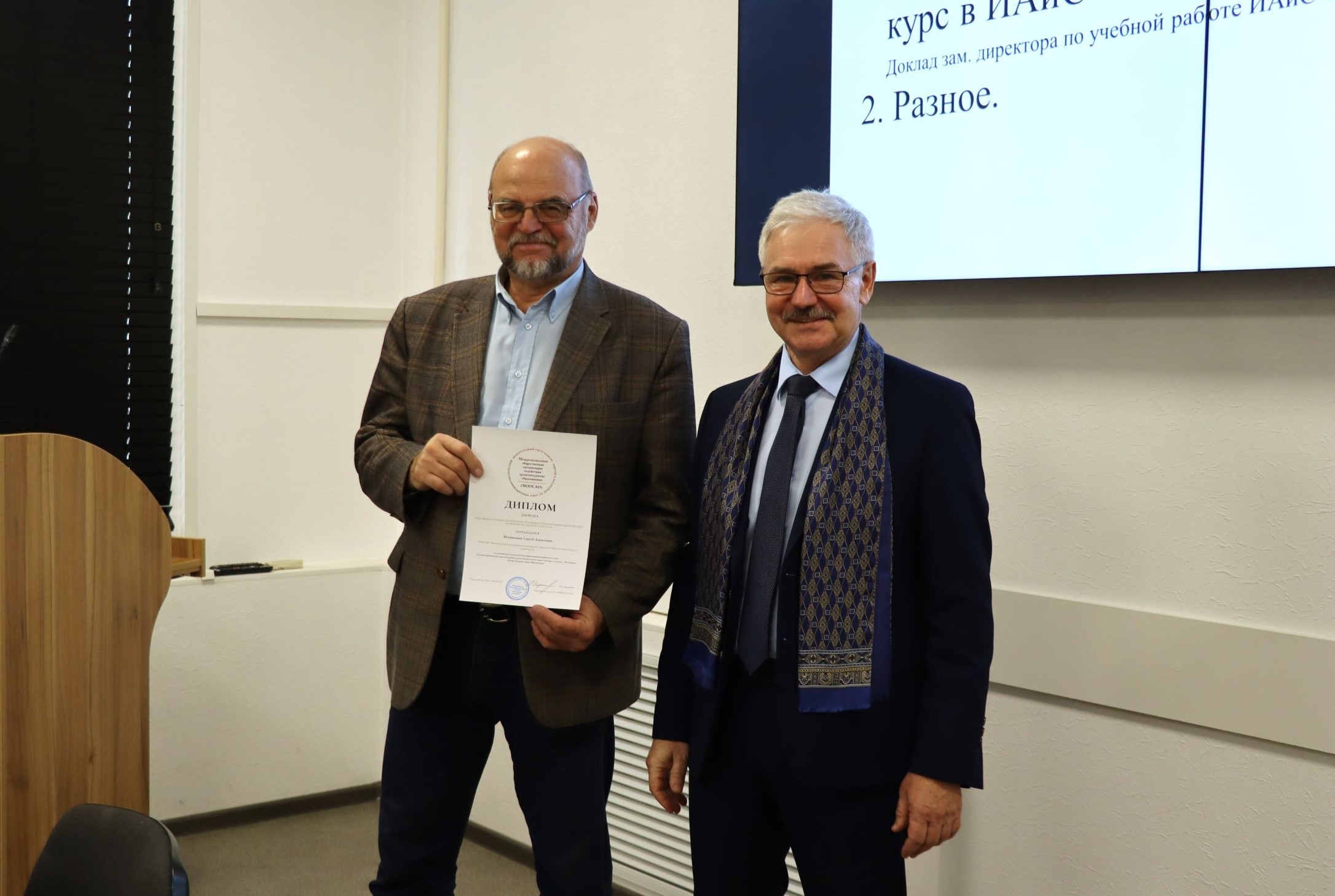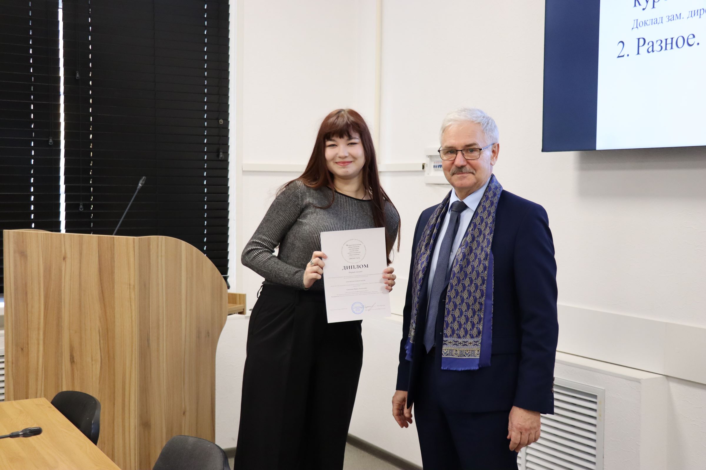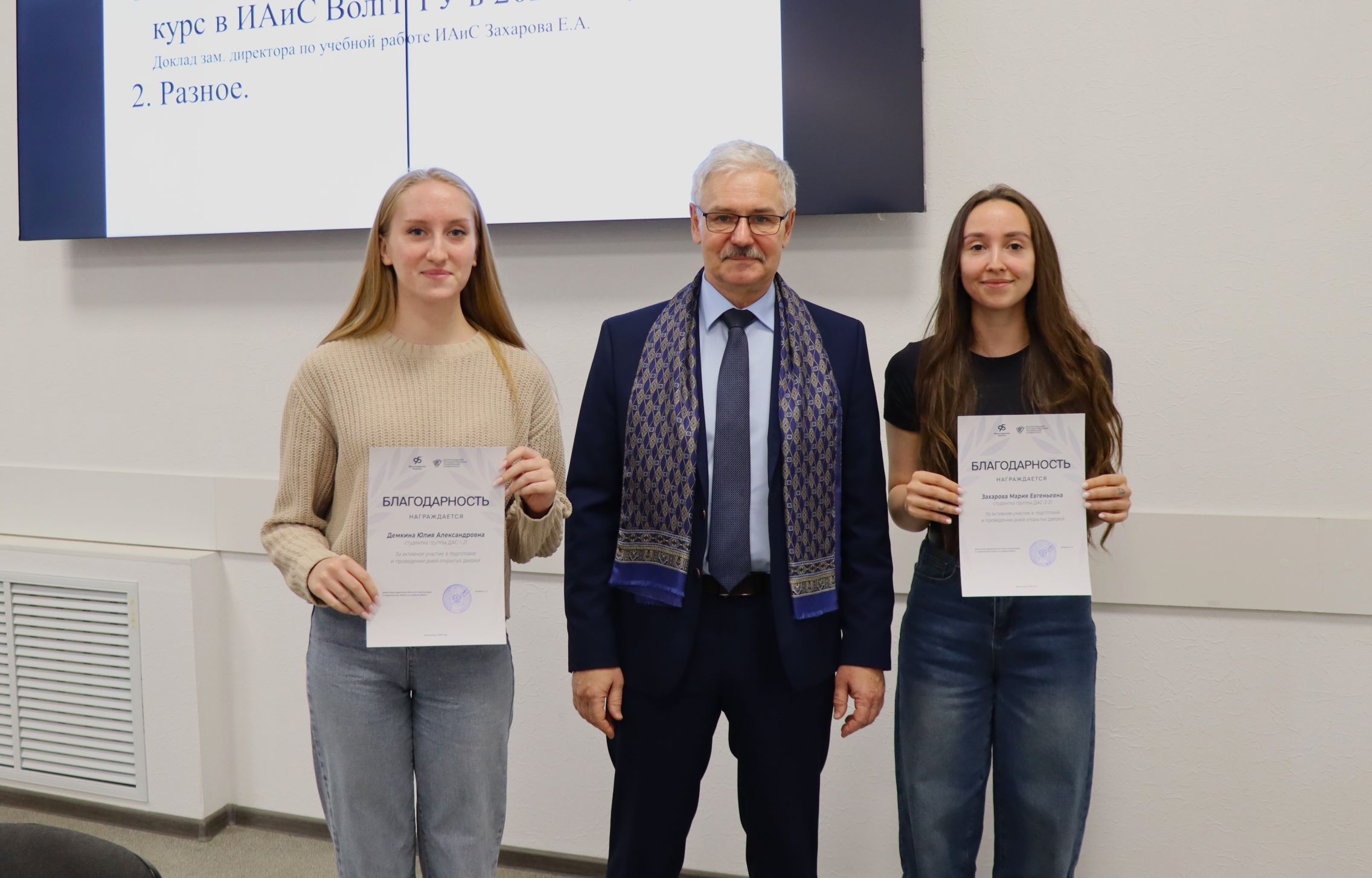 В начале заседания первый проректор – директор ИАиС ВолгГТУ Олег Викторович Душко вручил дипломы и благодарственные письма студентам и преподавателям за победы в конкурсах, за подготовку студентов – победителей конкурсов, за помощь в подготовке к мероприятиям и др. Дипломами XXXIV Международного конкурса научной и учебной литературы по архитектуре, дизайну и искусству награждены доценты кафедры дизайна и монументально-декоративного искусства Н.Г. Матовникова, Е.М. Пышта, П.В. Самойленко. Дипломы XXXIV Международного смотра-конкурса лучших выпускных квалификационных работ по архитектуре, дизайну и искусству вручены выпускниками ИАиС Полине Булановой, Марине Сашенковой, Арине Ерониной. Кстати, Арина награждена дважды – ей вручен и диплом лауреата конкурса Национальной академии дизайна за проект «Световая организация архитектурной среды Центрального парка культуры и отдыха Волгограда» (руководитель – С.А. Матовников). Благодарственное письмо за реализацию проекта по установке памятного знака вручено доценту кафедры ДиМДИ В.В. Юшину. Доброволец УПЧ Дмитрий Касьянов получил благодарственное письмо директора лицея № 11 за подготовку и проведение профориентационной игры «Миссия выполнима», а студенткам архитектурного факультета Демкиной Юлии и Марии Захаровой вручены благодарности за активное участие в подготовке и проведении дней открытых дверей.