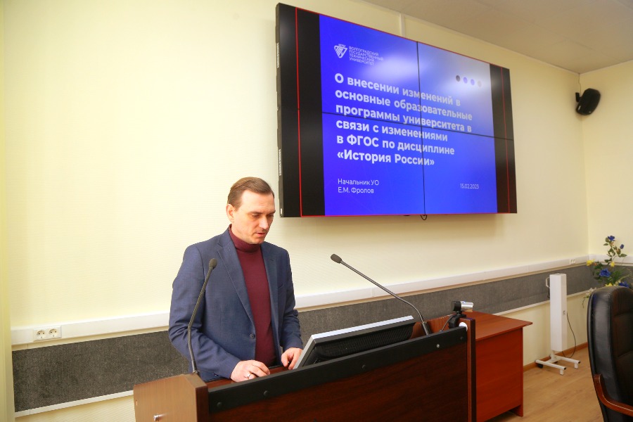 Докладчиком по первому вопросу выступили Евгений Геннадиевич Ефимов, профессор кафедры истории, культуры и социологии, и Евгений Михайлович Фролов, начальник учебного отдела. Евгений Геннадиевич рассказал о Концепции преподавания истории России для неисторических специальностей и направлений подготовки, реализуемых в образовательных организациях высшего образования. Изменения, предусмотренные документом, позволят, например, расширить региональный компонент в изучении дисциплины, охватить новейшую историю вплоть до 2022 года и др. А Евгений Михайлович объяснил, как будут распределены академические часы в преподавании дисциплины на различных формах обучения.