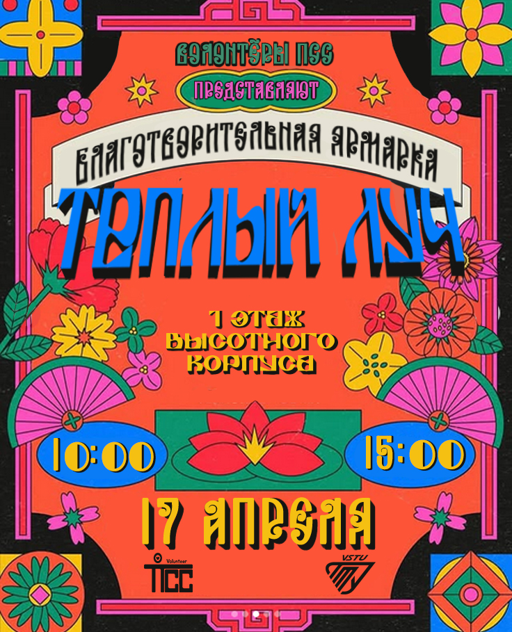 Настоящее, дружное тепло пришло в наш город и значит, скоро быть традиционной весенней благотворительной ярмарке «Теплый луч»! Волонтерский отряд извещает о том, что день ярмарки назначен – она состоится 17 апреля на 1 этаже высотного корпуса! Напоминаем, что все вырученные средства будут направлены в помощь онкобольным детям, детям-сиротам из Дома ребенка, приютам для бездомных животных.