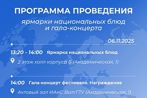 6 ноября 2025 года вы окунётесь в настоящий праздник дружбы народов. Уже в 13:20 перед актовым залом ИАиС ВолгГТУ начнёт работу «Ярмарка кулинарных блюд» — здесь вы сможете не только отведать национальные деликатесы со всего мира, но и познакомиться с их историей, узнать секреты приготовления и пообщаться с теми, кто готовил с душой и любовью.