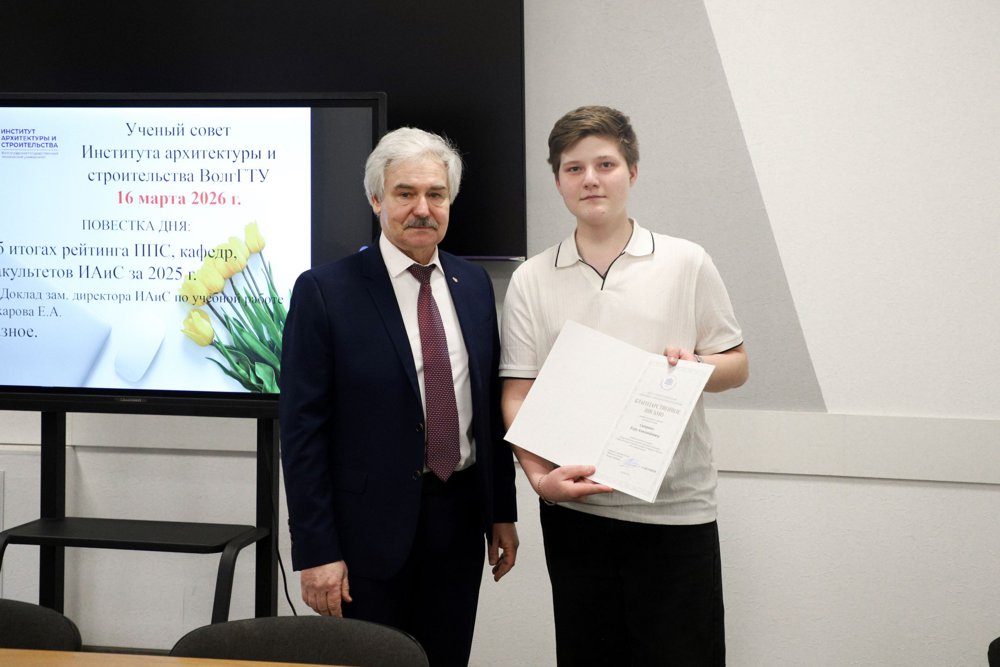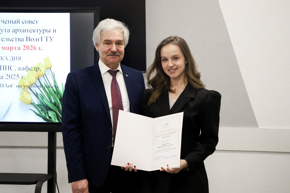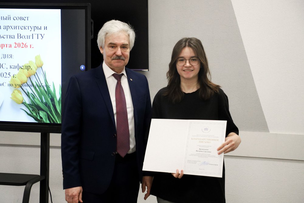 16 марта в Институте архитектуры и строительства состоялось очередное заседание Ученого совета. По традиции, начали с награждений: в торжественной обстановке О.В. Душко вручил группе студентов благодарственные письма А.А. Волоцкого. Высокой оценки они удостоены за активное участие в деятельности Волгоградского корпуса волонтеров.
