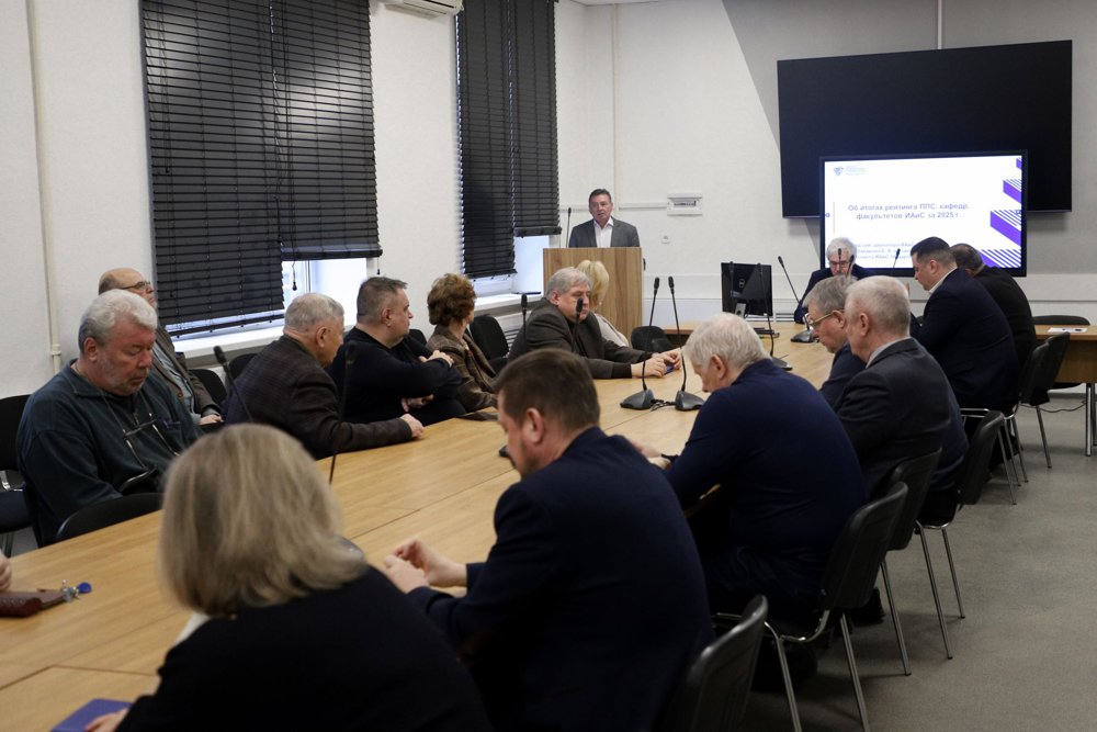 Основным вопросом повестки дня стал доклад заместителя директора по учебной работе Е.А. Захарова «Об итогах рейтинга профессорско-преподавательского состава, кафедр и факультетов ИАиС за 2025 год». Евгений Александрович Захаров представил детальную картину результатов минувшего года, отметив как успехи лидеров рейтинга, так и зоны, требующие повышенного внимания.